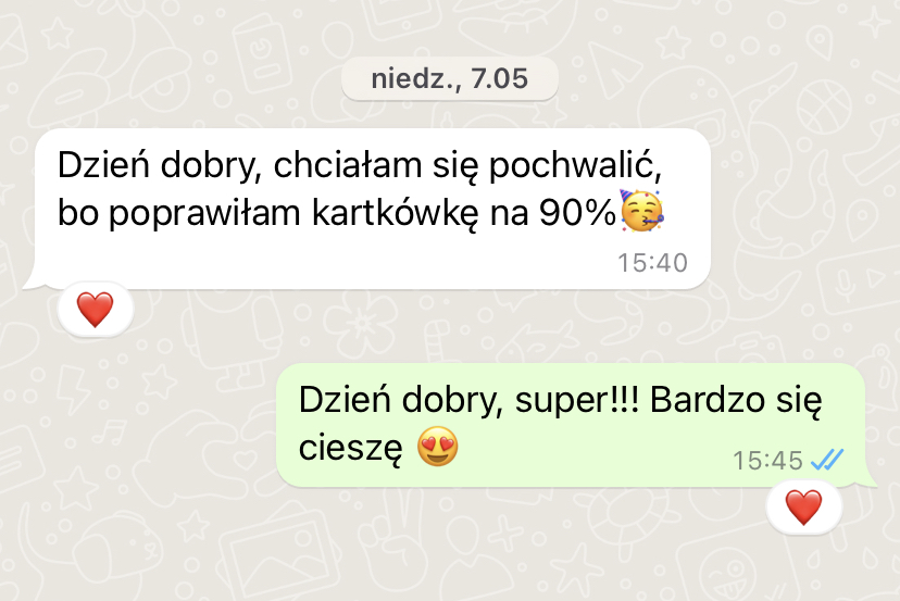 Moi uczniowie zawsze mogą na mnie liczyć. Odpowiadam na każde pytanie i na każdą prośbę o dodatkowe zajęcia przed sprawdzianem czy kartkówką. Mamy ze sobą stały kontakt i staram się żebyście czuli się swobodnie pisząc do mnie z prośbą o pomoc w zadaniu!