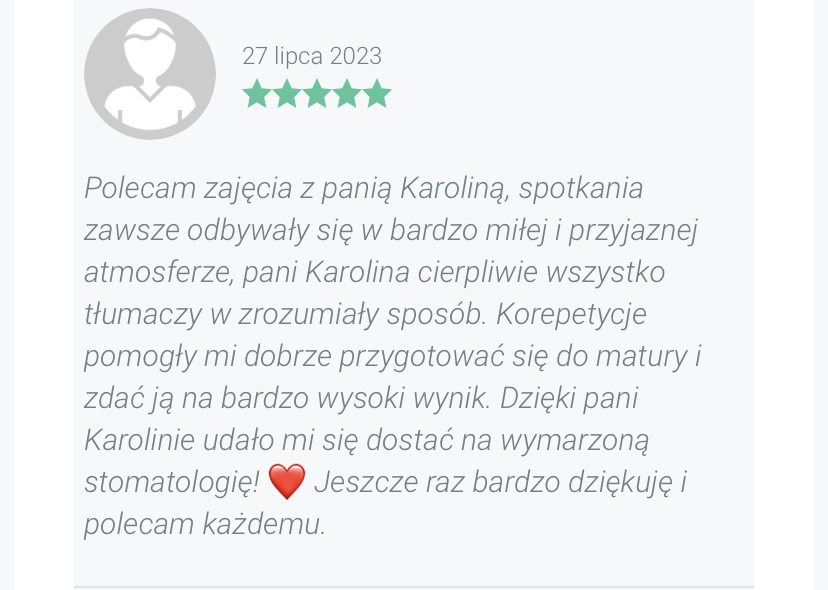 Znam dokładnie wymagania maturalne. Cały czas szkolę się, aby mieć bieżącą wiedzą ze sposobu oceniania zadań maturalnych i najnowszych wytycznych.